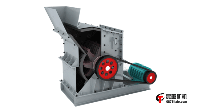 高效細(xì)碎機(jī)的主要工作部件為帶有錘子(又稱錘頭)的轉(zhuǎn)子。轉(zhuǎn)子由主軸、圓盤、銷軸和錘子組成。電動(dòng)機(jī)帶動(dòng)轉(zhuǎn)子在破碎腔內(nèi)高速旋轉(zhuǎn)。物料自上部給料口給入機(jī)內(nèi),受高速運(yùn)動(dòng)的錘子的打擊、沖擊、剪切、研磨作用而粉碎。在轉(zhuǎn)子下部,設(shè)有篩板、粉碎物料中小于篩子L尺寸的粒級(jí)通過篩板排出,大于篩子L尺寸的粗粒級(jí)阻留在篩板上繼續(xù)受到錘子的打擊和研磨,最后通過篩板排出機(jī)外。