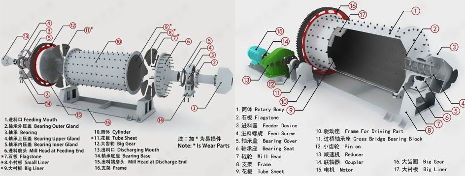 昆重礦機生產的濕式格子型球磨機主要是由進料器、出料器、端蓋、法蘭盤、筒體、中心襯板(格子板)、大齒輪、傳動總成(減速機、小齒輪、聯軸器、電機)等部件組成。格子型球磨機的格子板,一般使用高錳鋼耐磨料制作,耐磨性好,使用壽命較高。