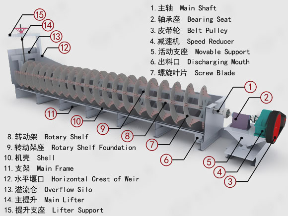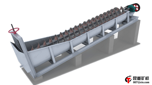 螺旋分級機主要用于選礦廠分級設備,與球磨機配套使用,形成閉路磨礦、分級閉路作業。主要由傳動裝置、螺旋絞龍、槽體、升降機構、下部支座(軸瓦)和排礦閥組成。