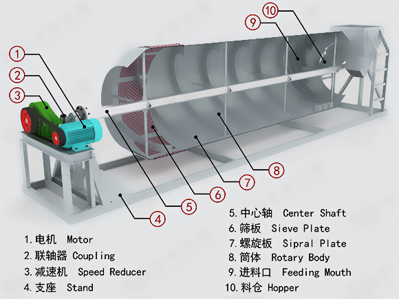 筒式洗礦機(jī)工作時,清洗筒體被四個拖輪支撐,電機(jī)帶動減速機(jī),大小齒輪帶動清洗筒體低速旋轉(zhuǎn);含有泥團(tuán)和雜質(zhì)的礦物自給料口進(jìn)入旋轉(zhuǎn)的滾筒內(nèi),被清洗滾筒內(nèi)安裝的一定角度的耐磨橡膠襯板不斷帶起拋落,自進(jìn)料端到出料端移動過程中多次循環(huán),并被順向或逆向的沖洗水沖涮洗滌,清洗干凈的骨料經(jīng)過卸料端筒篩篩分脫水后排出,含有污泥的廢水則通過出料或給料端的帶孔擋板流出。