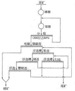 褐鐵礦石浮選-強磁選礦流程廣泛用于處理低品位礦石。強磁選適于分選粗粒礦物,浮選適于分選細粒礦物,兩者互為補充,擴大了粒級回收范圍。其選礦流程結(jié)構(gòu)有強磁選得精-磁尾浮選和強磁選拋尾-磁精浮選兩種。